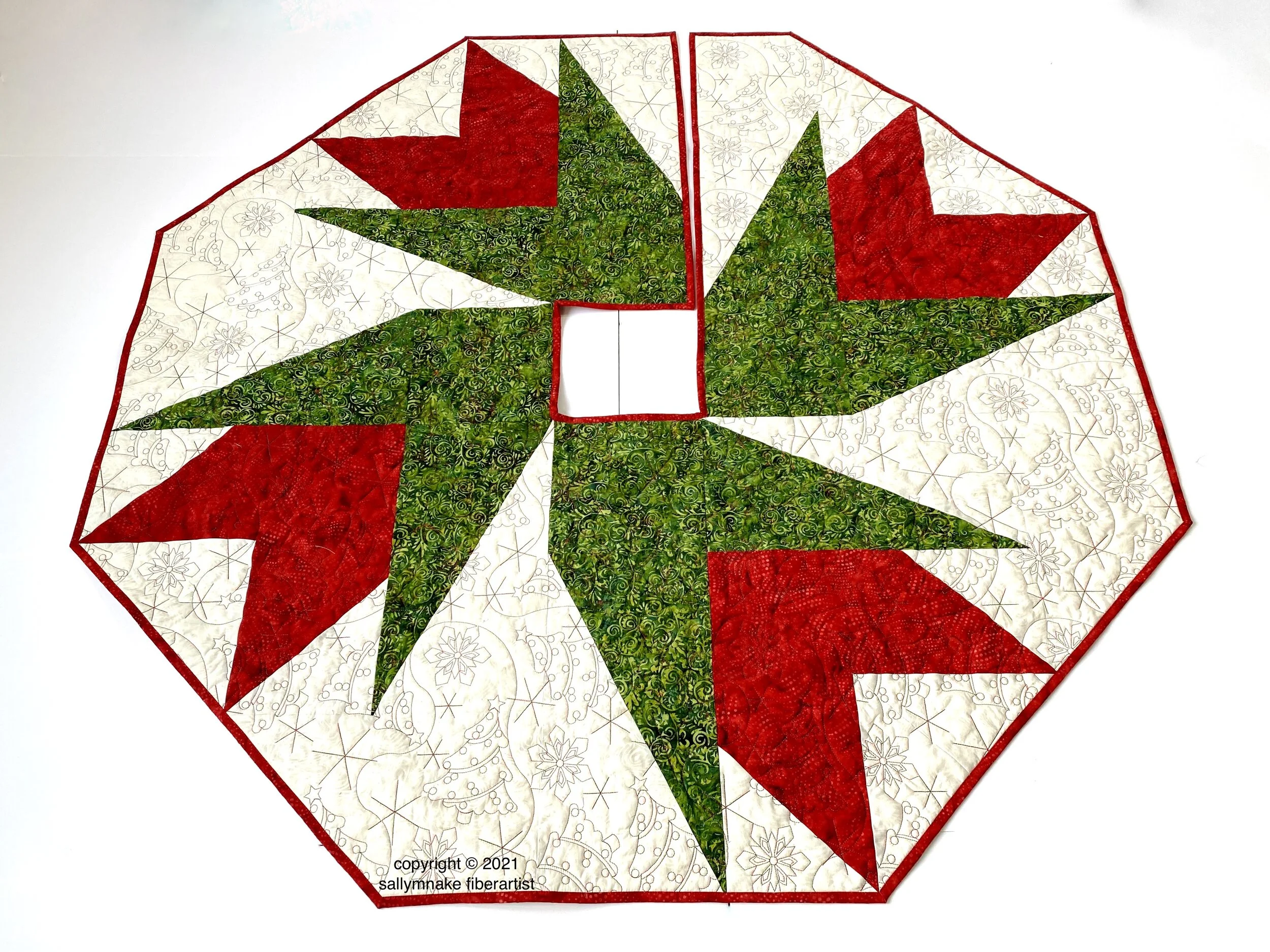 The Island Batik Ambassador July Challenge is “Never Too Early.” Summertime but it’s the best time of all to get an early start on Christmas and holiday projects. This thought sparked my tendency to push myself so I created two Christmas Tree Skirts, a modern Christmas Cactus and a traditional favorite Patchwork Tree Skirt.