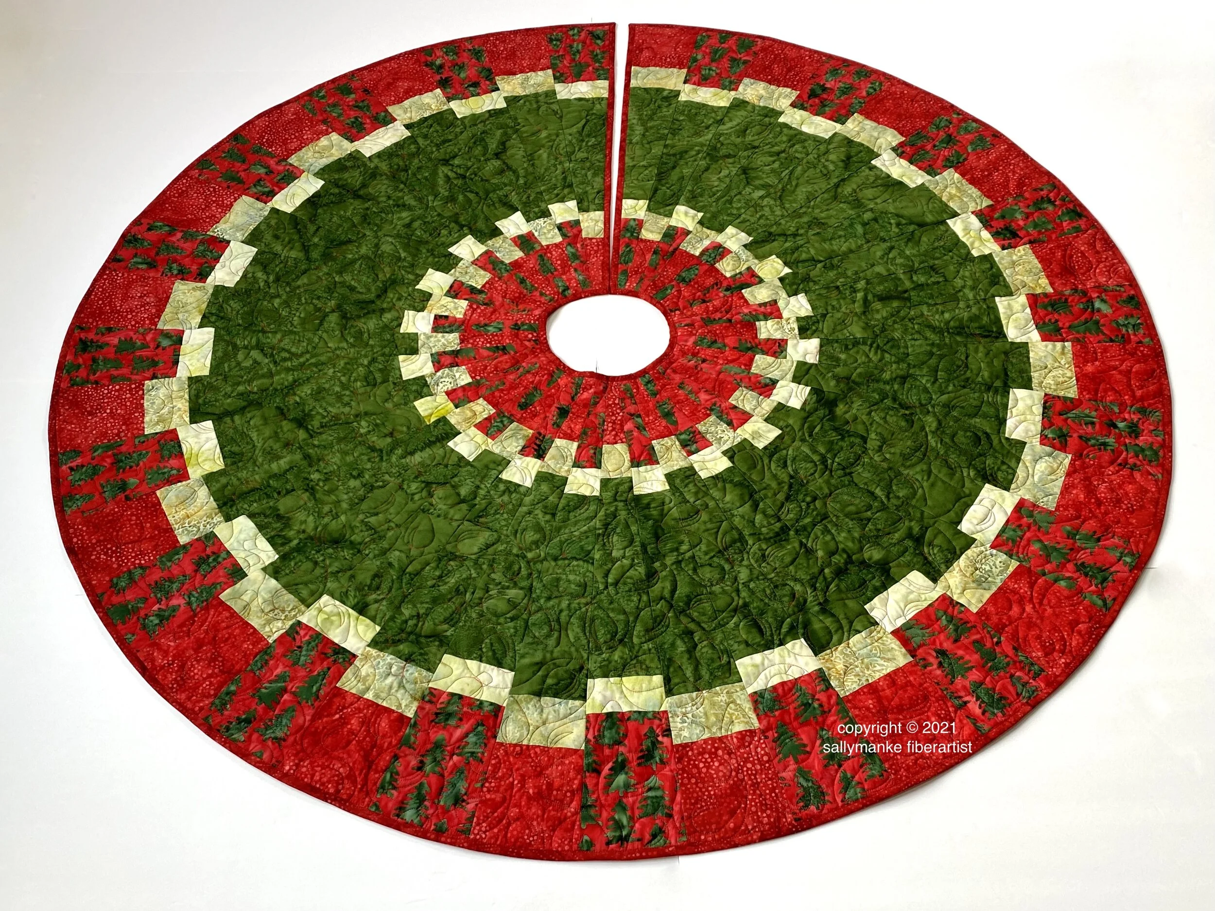 Switching things up on the second tree skirt with that looks like a ton of work but goes together quickly. From my Island Batik stash, I selected a Christmas green as the main fabric, two lighter accent colors and two reds for the borders. The pattern is available in both hard copy or instant PDF download in my Etsy Shop.