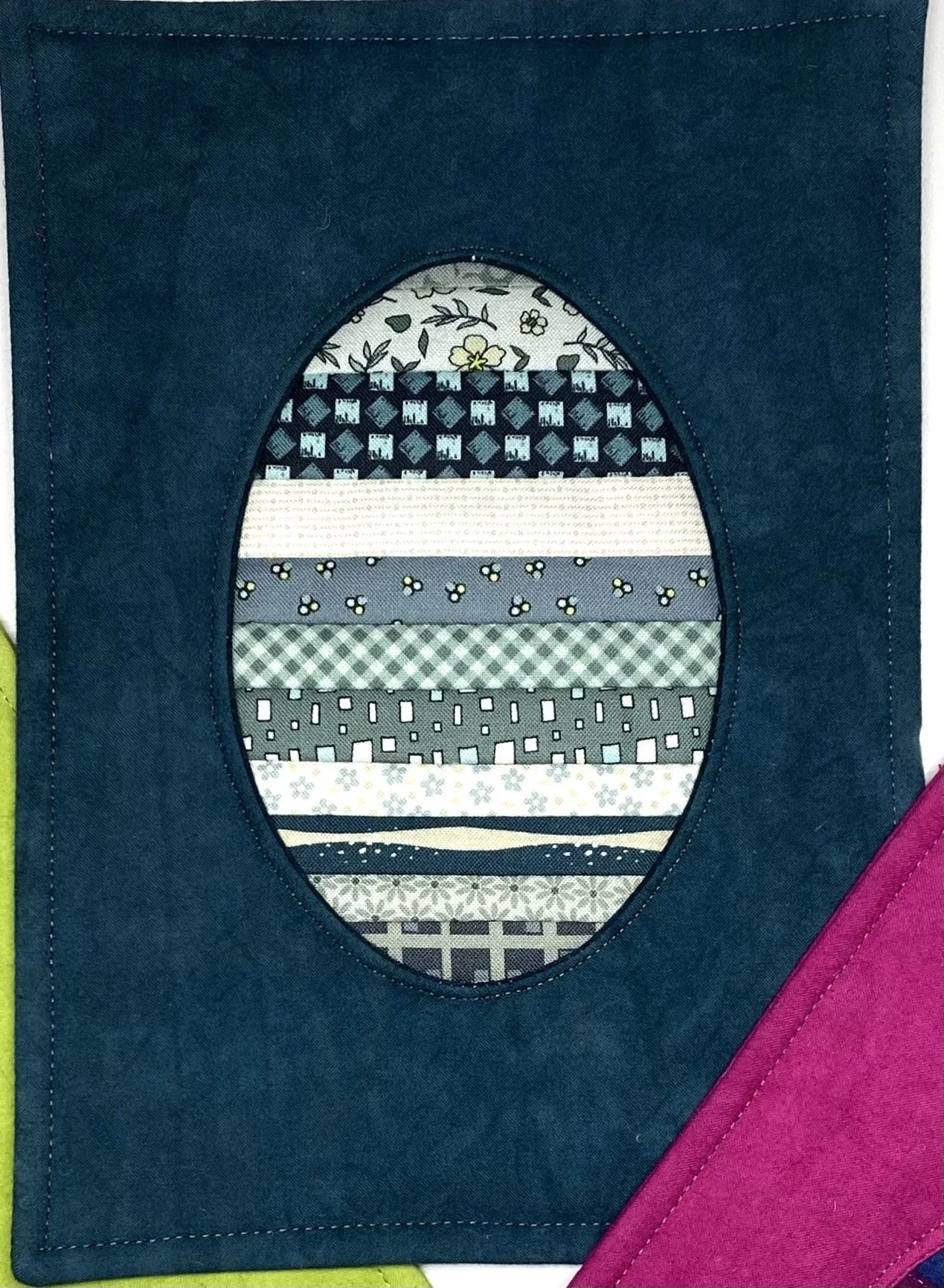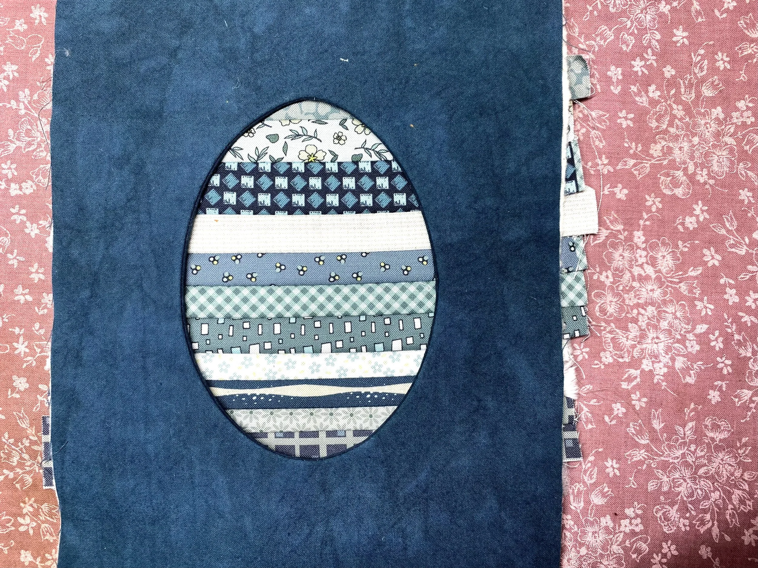 An egg shape was marked on the wrong side of a slightly smaller fabric. Centering the smaller fabric on one of the batting fused fabrics with right sides together, stitch on the marked line. Trim the center out leaving 1/8 to 1/4 inch. Clip curve.