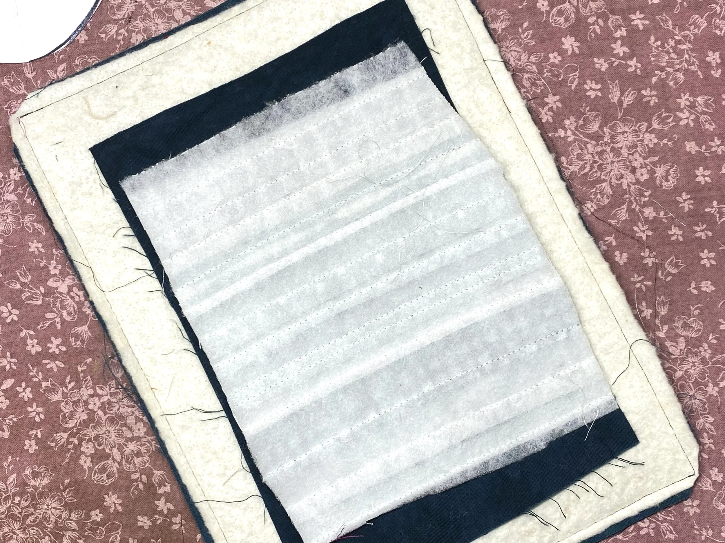 Place the quilted strip section under the opening. Trim strip section approximately one inch smaller than the frame unit.