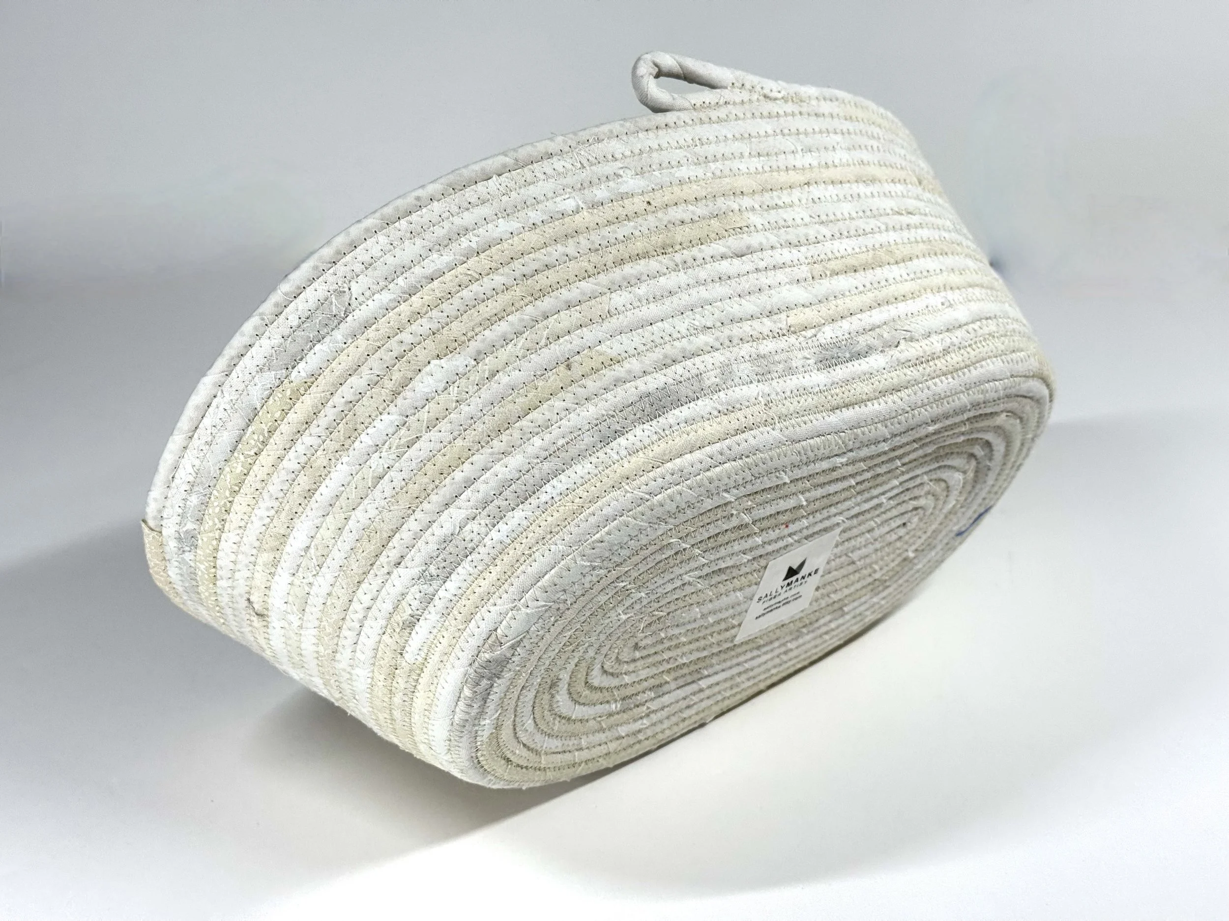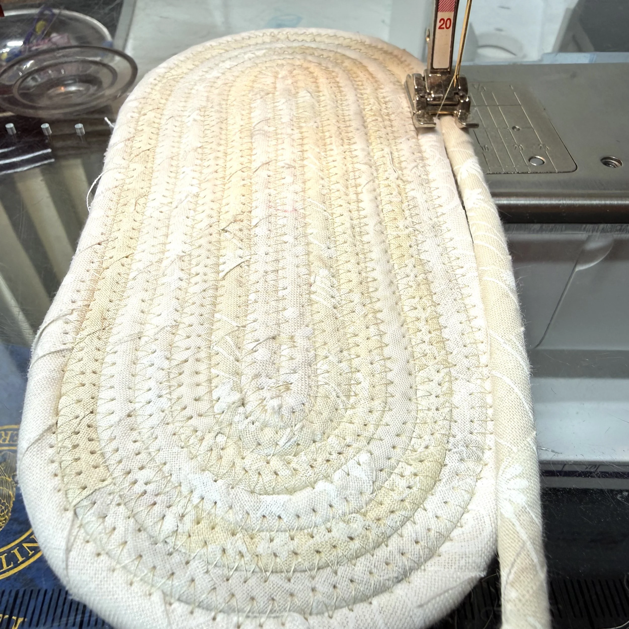 Challenge 17.1 for Project QUILTING highlights Pantone Color of the Year, CLOUD DANCER. Okay, so that’s really WHITE. A returning shopper in my Etsy Shop requested a white/off-white coiled rope basket to replace her previous one after changing the decor in her home. I’m off to achieve two ends with a single effort!
