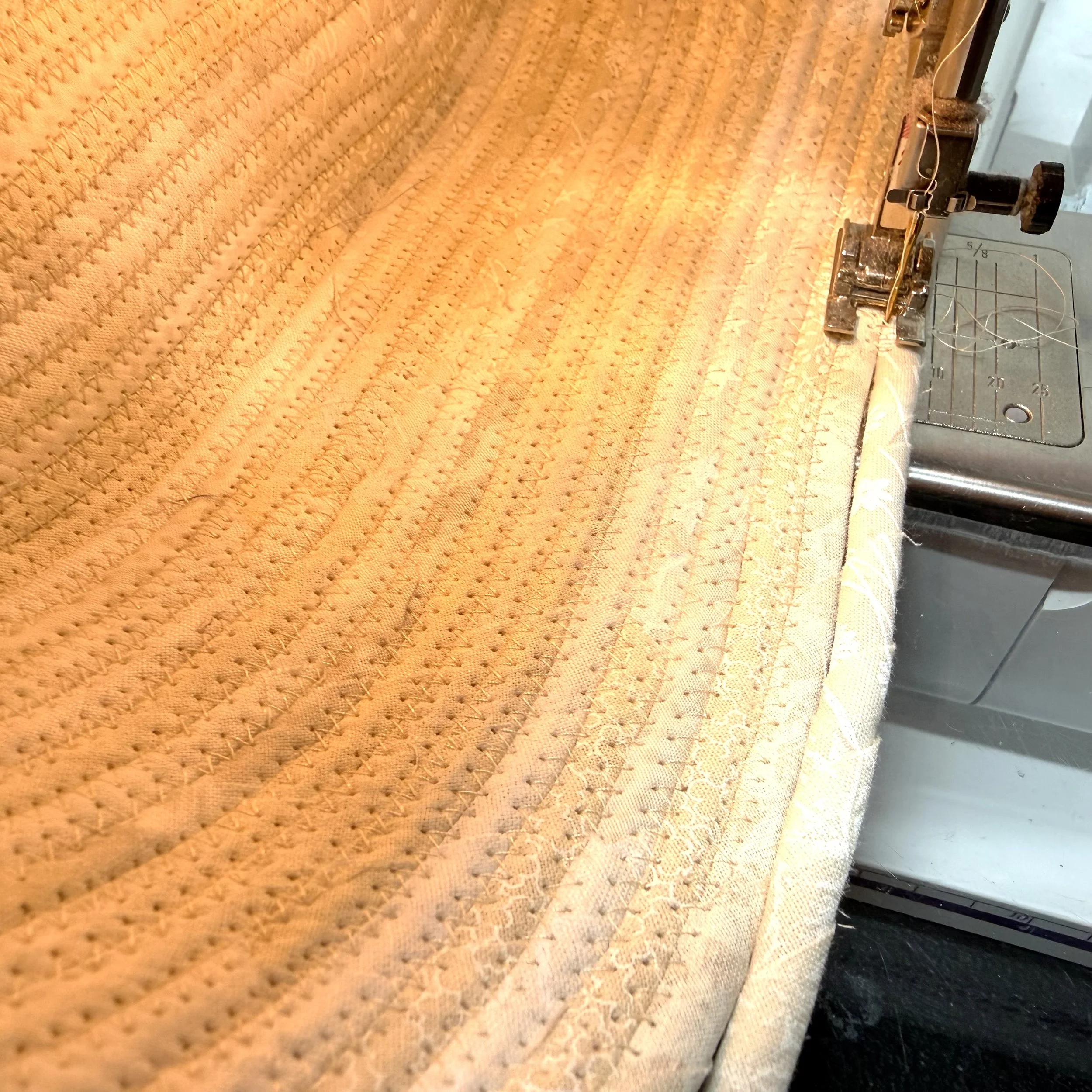 With the bottom completed, the project is turned to create sides. The smaller the ‘head’ of the machine, the easier it is to tip up and stitch. (apologies for the dark photo…the shadow makes it look darker than it is.)
