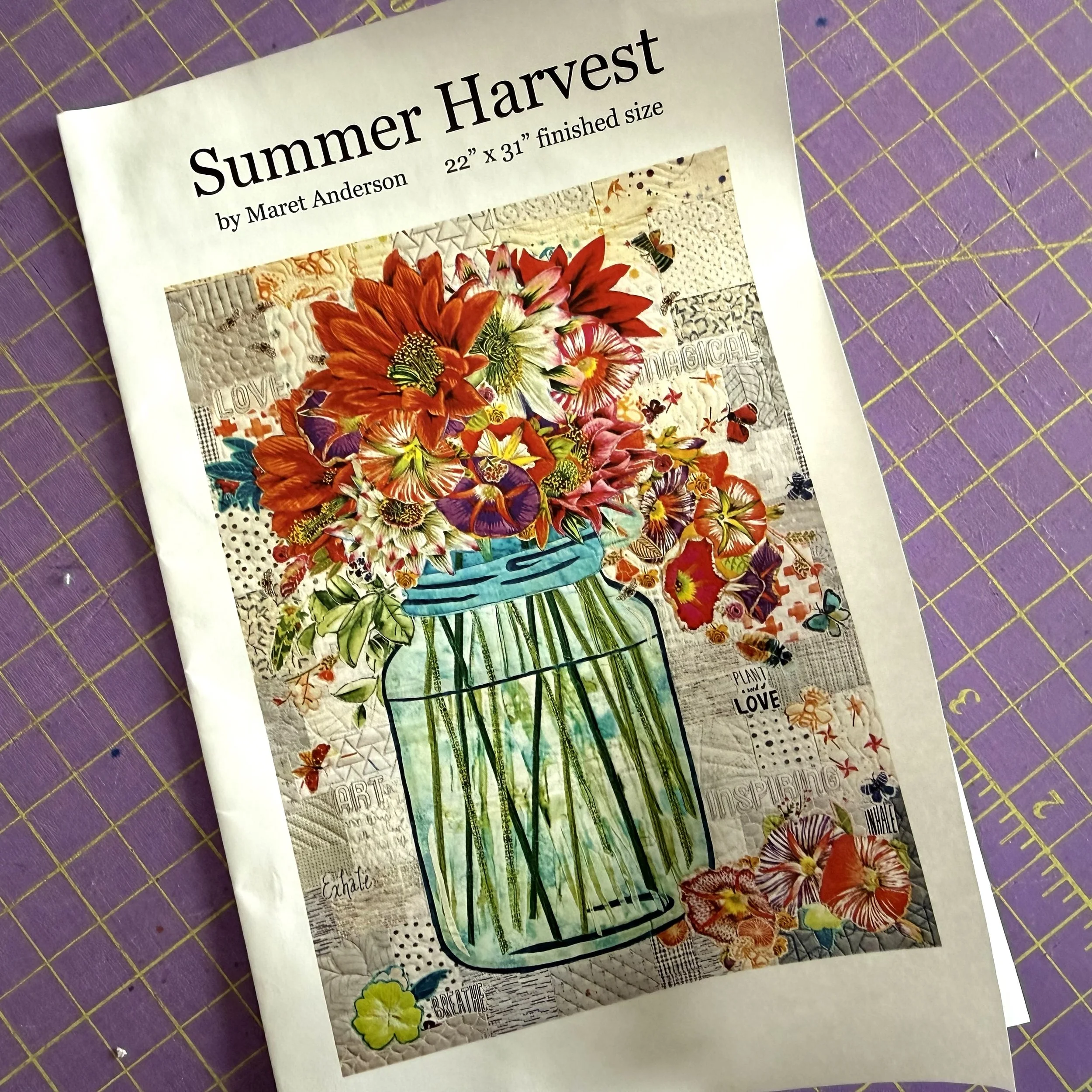 We all have those patterns purchased with good intentions! I loved the finished art quilt, Summer Harvest, by Maret Anderson. The supplies listed and directions didn’t work for me. Always one to reinvent the wheel, it was time enjoy the amazing pattern design with my choice of supplies and techniques.