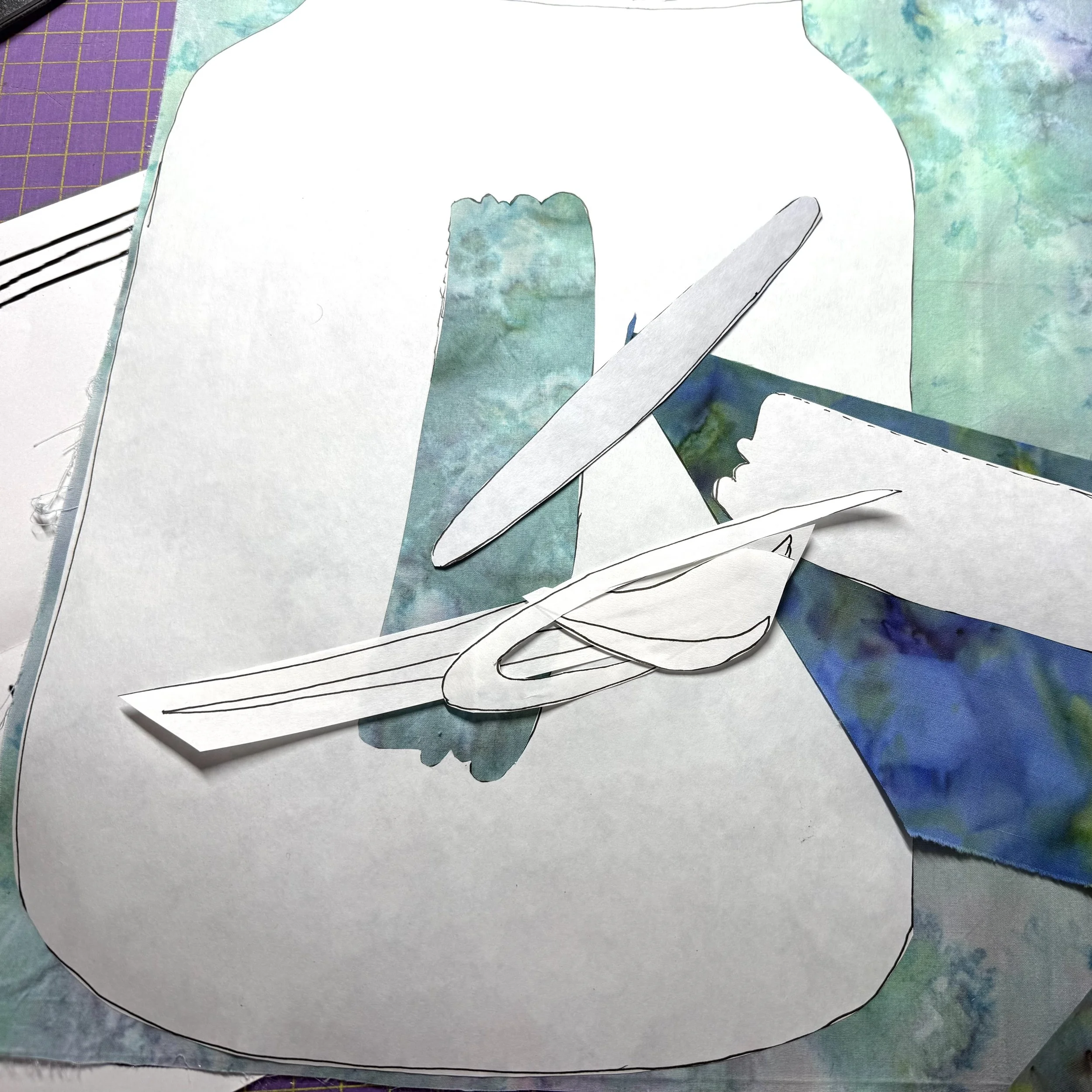 The jar pattern and its parts are traced on freezer paper. A selection of batiks has MistyFuse applied to one side and the freezer paper pattern pressed to the other.