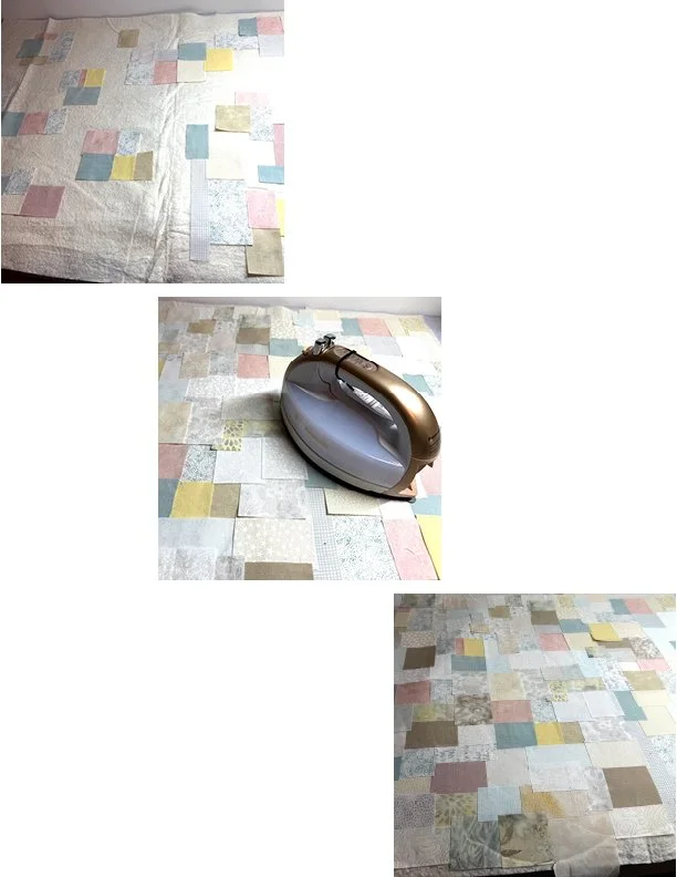 Using a zillion of my "what in the world did I save this for" tiny, low-volume scraps and a leftover fusible batting, the background is being created. This background piece was quilted next. Sadly, I totally forgot to take a photo of that process.