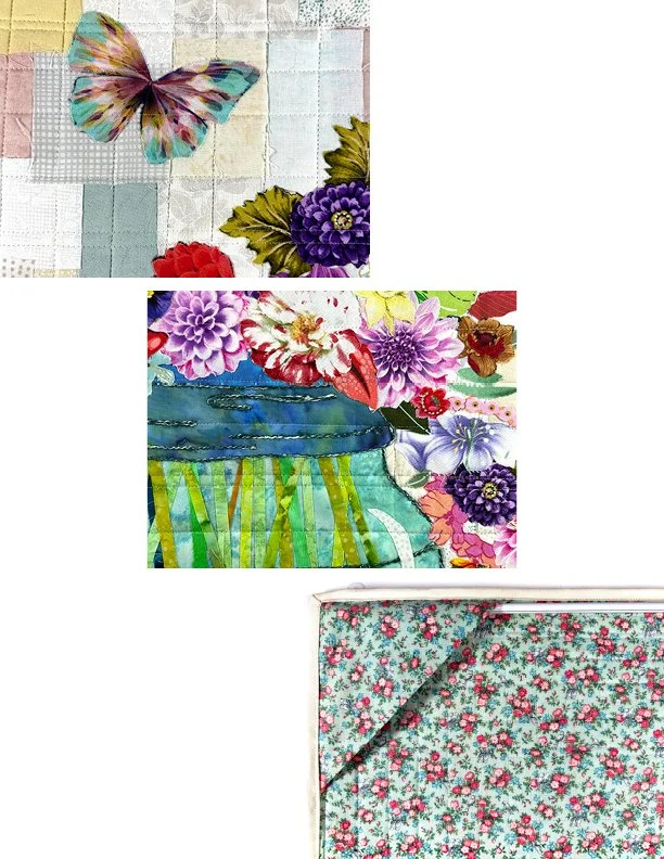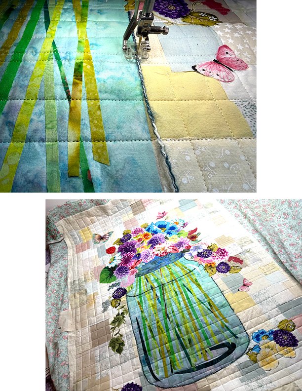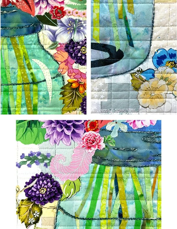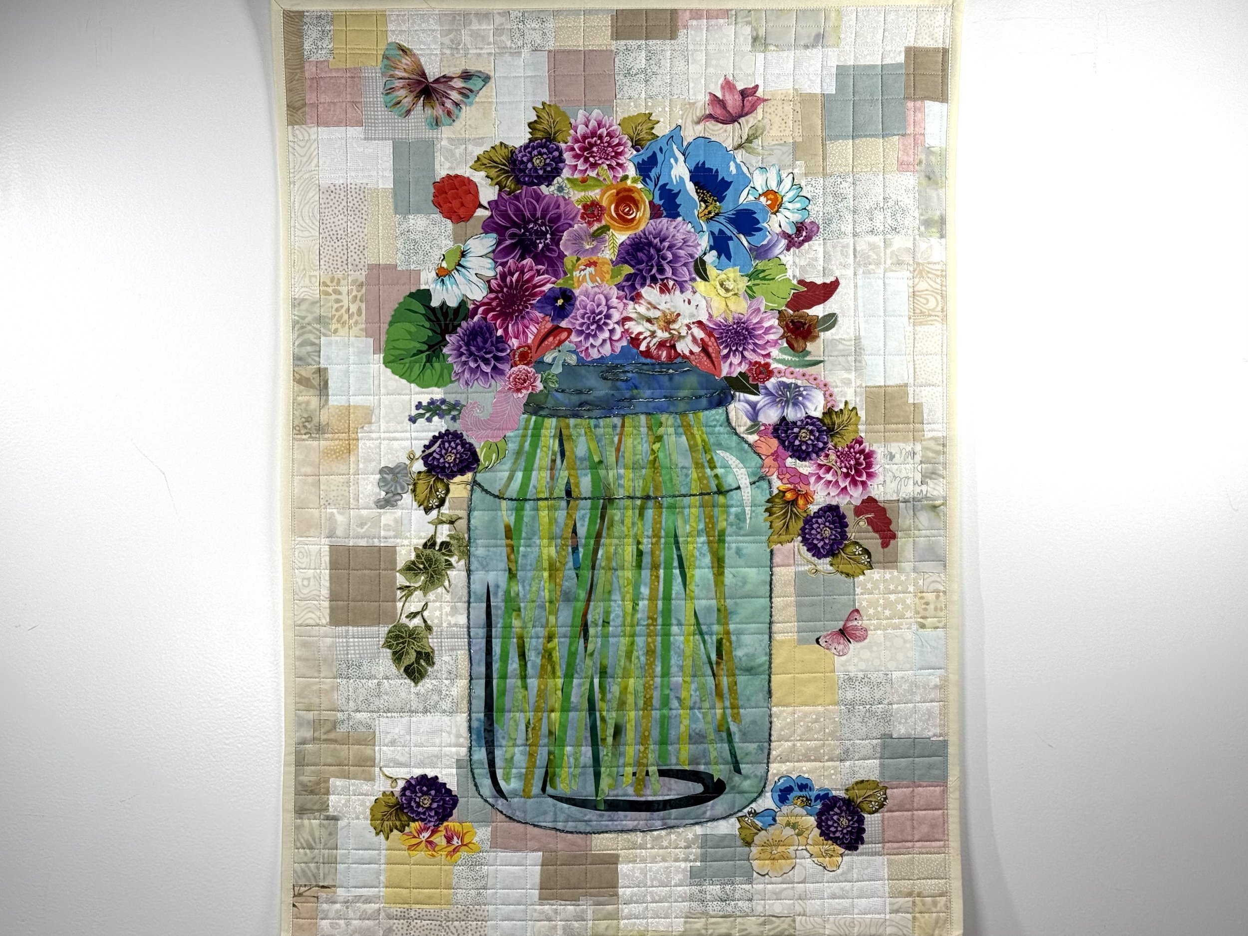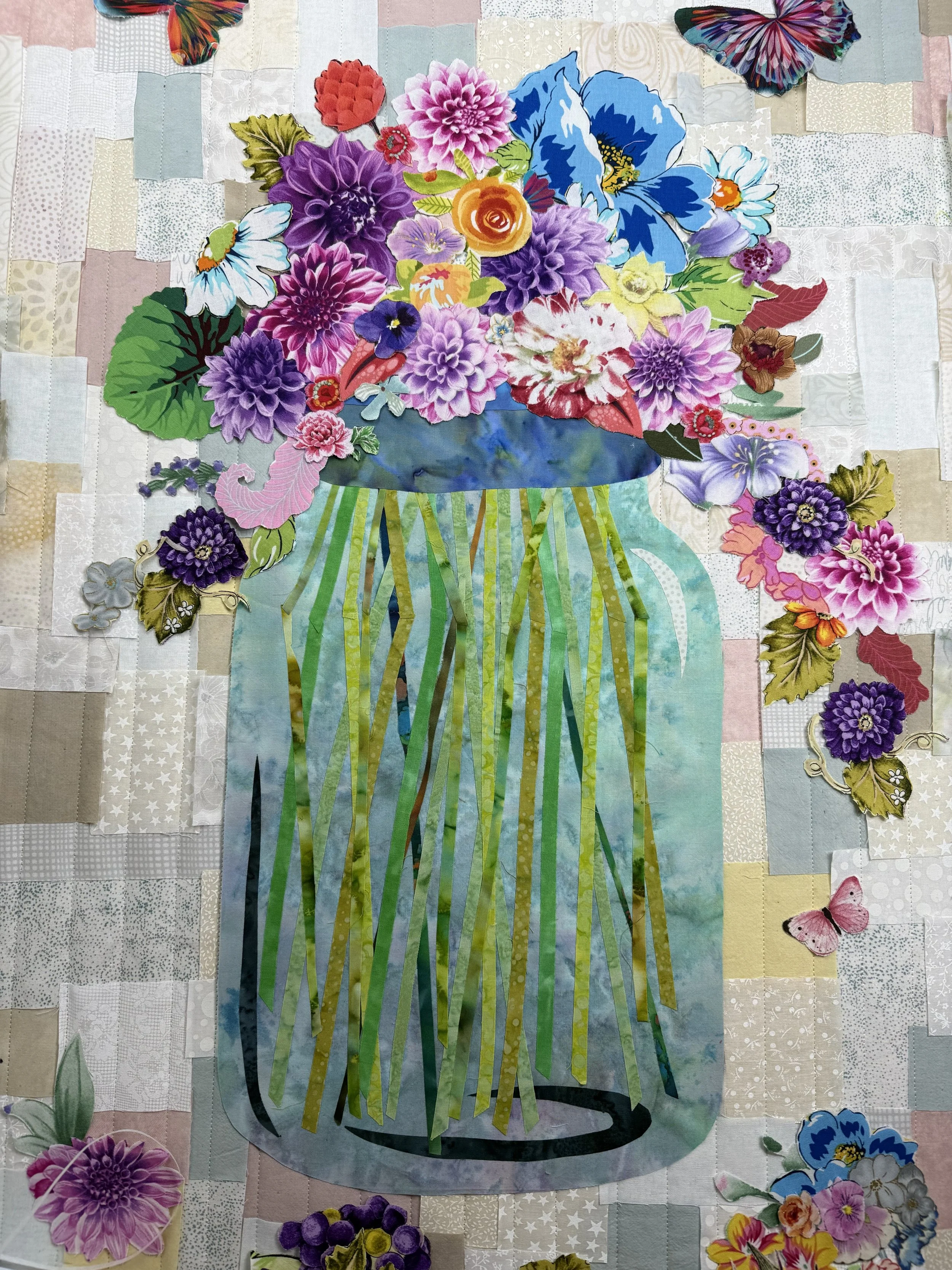 Fussy cut, printed fabrics with MistyFuse bonded to the wrong side are arranged in and around the jar. Pro Tips here - 1. Keep a stash of fused and cut flowers in your stash. You will thank yourself on days like this. 2. Always cut more flowers than you think you’ll need. 3. Take photos BEFORE you fuse everything in place. The photos give you another view of your project.