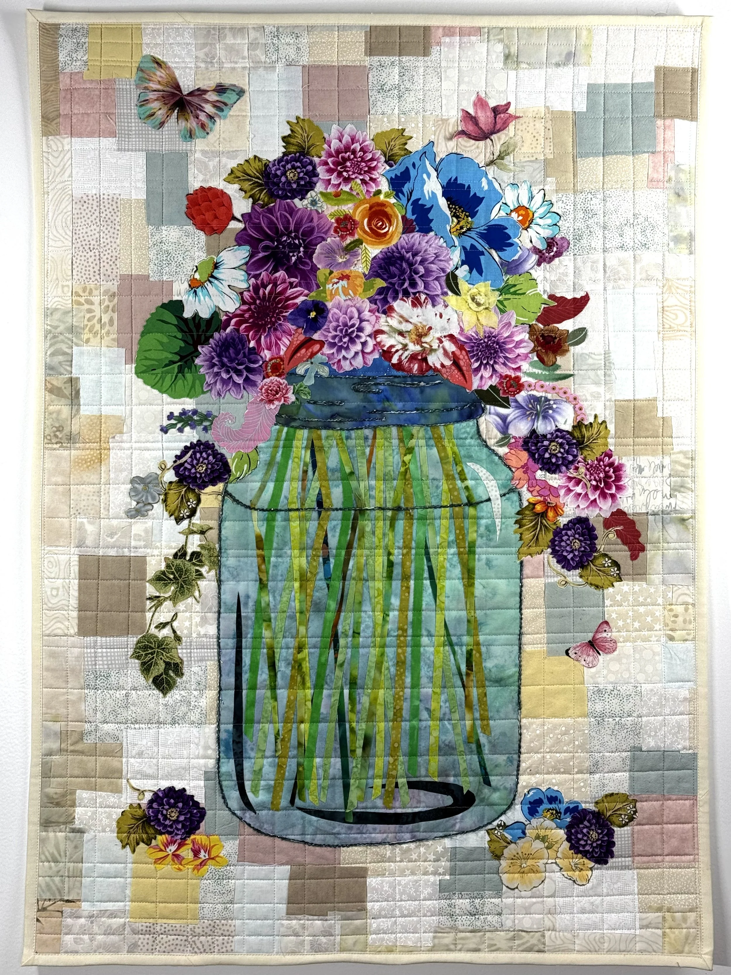 Challenge 17.4 for Project QUILTING is Of Another Era. This project represents a few eras in my life. First, what I called my Mother Earth News era. Canning and freezing food, baking from scratch, stitching our families’ clothing and even washing cloth diapers. The blue Ball Jar in this art quilt represents that time. My current era is living in an area where roadside stands burst each summer with homegrown produce and fresh-cut flowers fit.