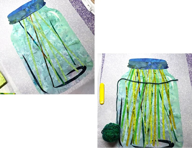 Using a silicone sheet to protect the ironing surface, the jar, acccents and flower stems are fused. A yarn is auditioned for possible details on the art quilt.
