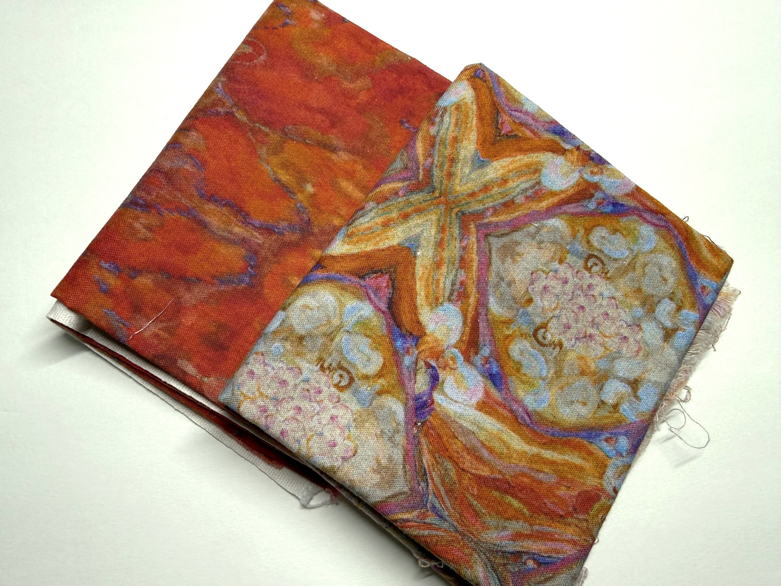 As I eyed my stash for this project, this rich orange and soft blue called to me. They are from an assortment of coordinated fat quarters that spoke to me at a national quilt show louder than they did when I got them home!
