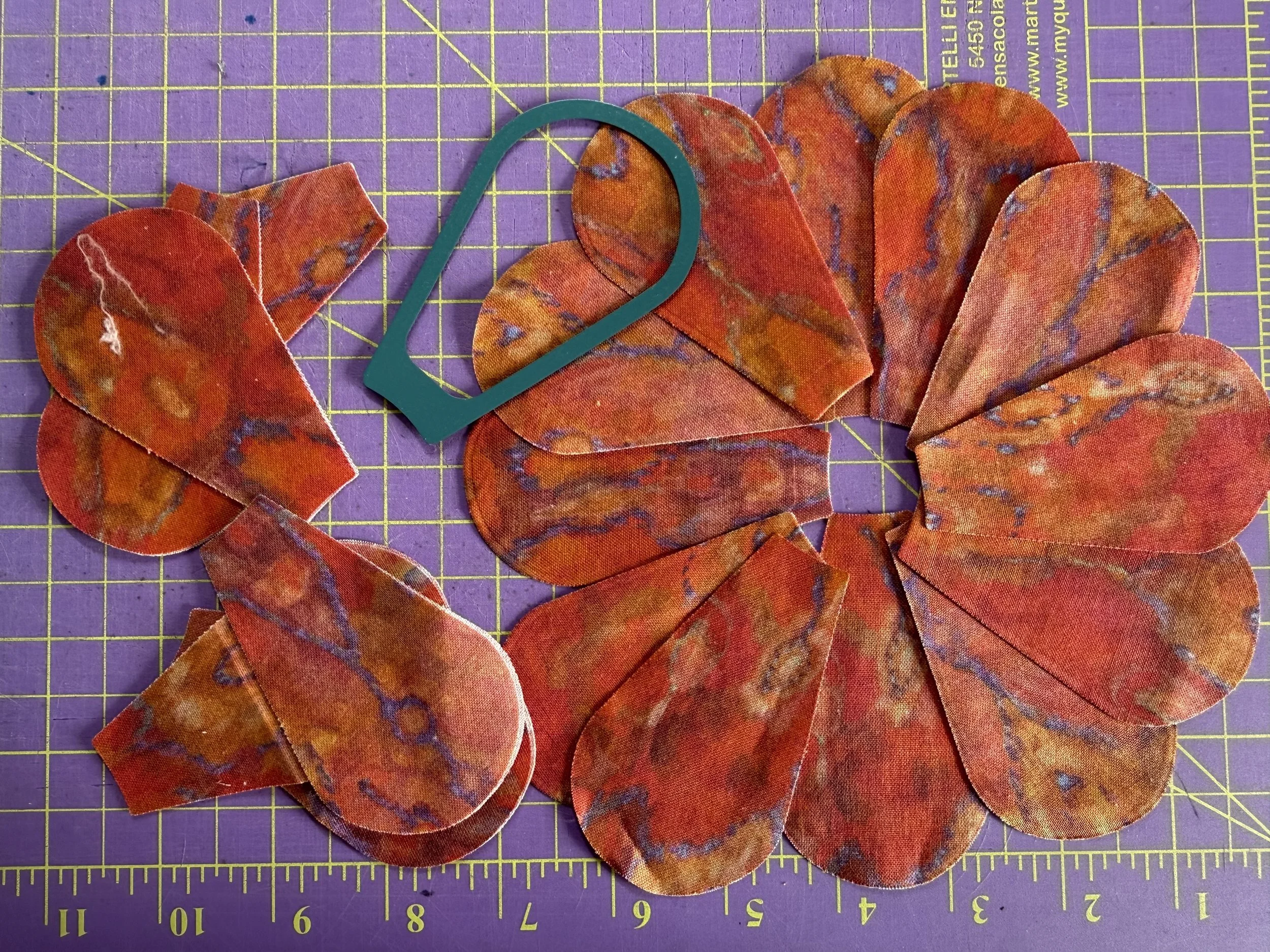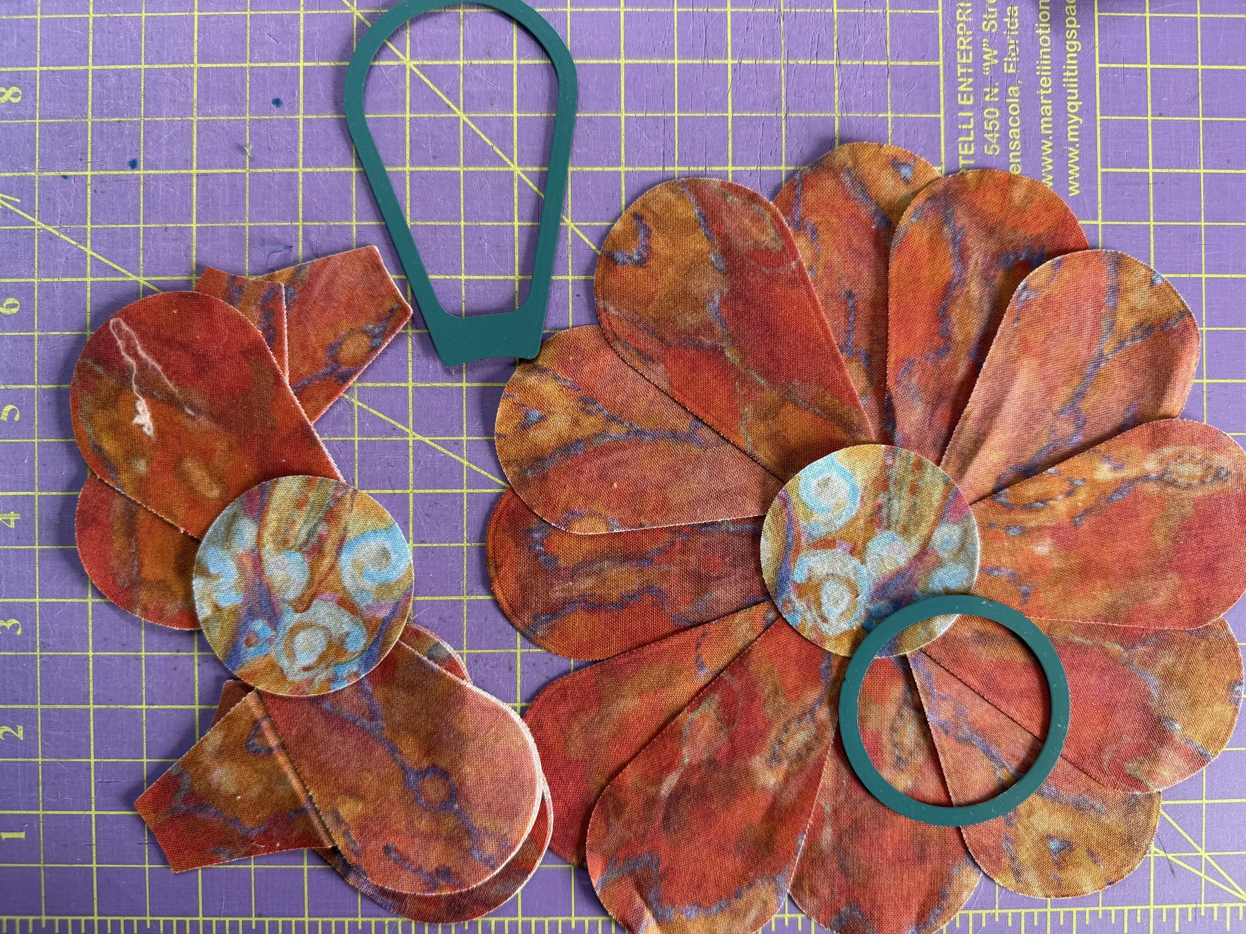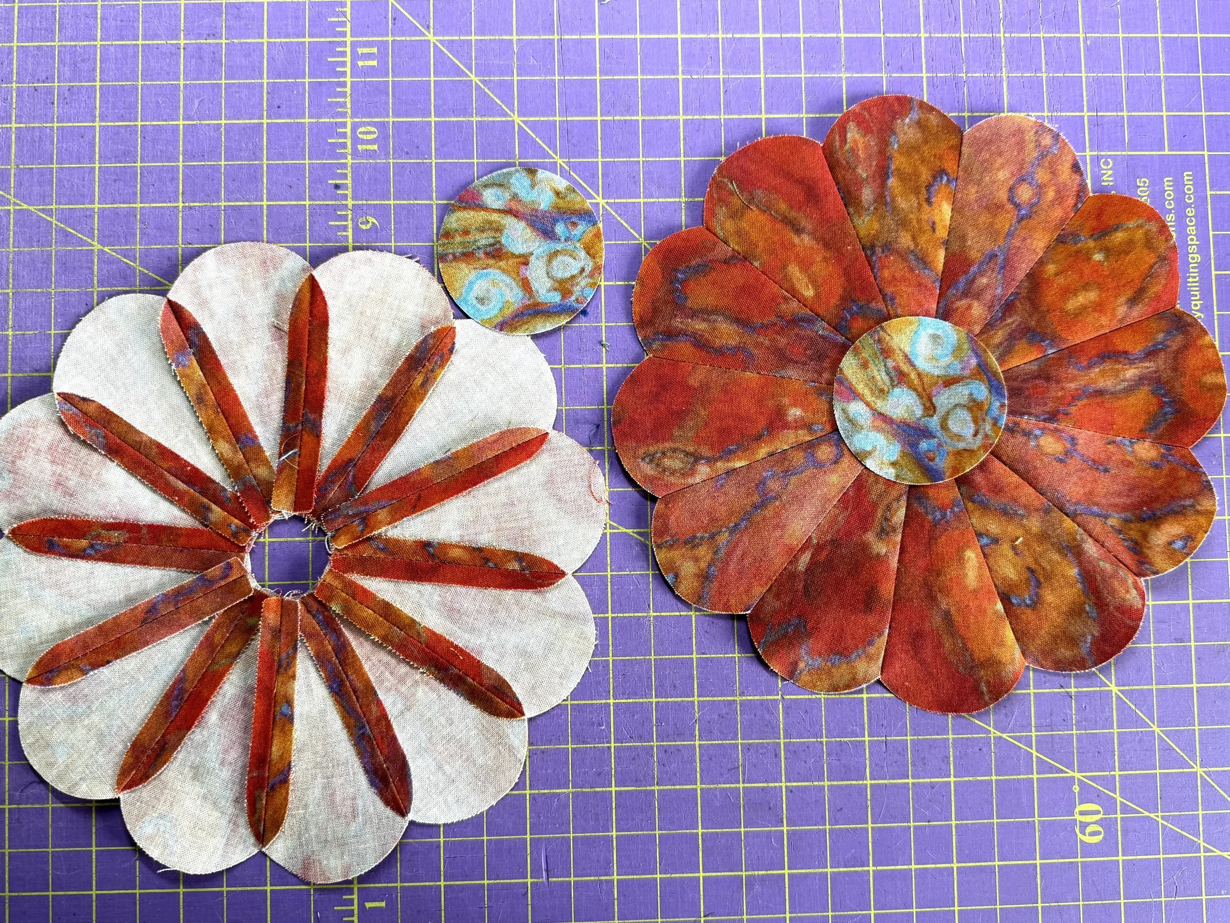 The twelve wedges are stitched together with a 1/4' seam. Seams are pressed open to keep the finished project as flat as possible. Auditioning the center circle, which will be applied to the finished product.