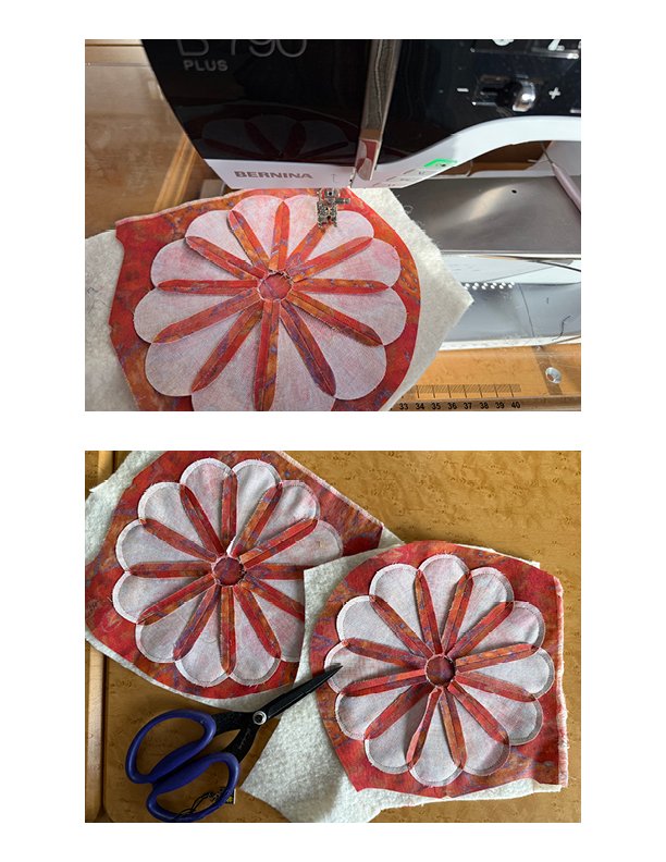 Each quilt unit was carefully turned right side out through that tiny center hole—such a win-win, as no hand sewing is required. The Dresden curves are quilted through all layers with machine stitching. The center circle is fused over the opening. Setting my BERNINA 790 Plus to a triple blanket stitch, the circle is machine appliqued as the final step.